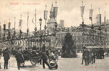 Legia. - Ostende - Grand Place. - We zien het Oud Stadhuis op het Wapenplein, de muziekkiosk en op de voorgrond rechts een ijscokar, links een paardenkoets