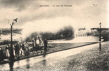 Ostende. - Un jour de tempΓͺte. - De Zeedijk tijdens stormweer. Ook de straatverlichting moet er aan geloeven
