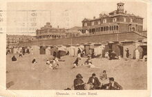 Het Koninklijk ChΓ’let gezien van op het Groot Strand. Strandcabines tegen de dijk