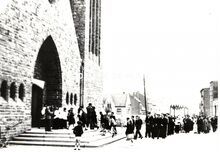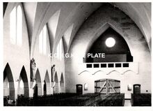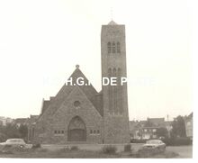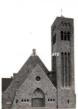 Formaat : 13 x 18 cm. - De kerk werd gebouwd tussen 1956 en 1959 naar de plannen van architect Sylvain Smis onder het pastoraat van Georges Borre. Pseudo-gotische kerk onder één zadeldak, met uitspringend westportaal, een klein transept en uitgebouwd koor, met de toren op het zuidwesten. Tijdens een plechtigheid in de noodkerk (Nieuwpoortsesteenweg) werd door Deken Butaye overgegaan tot de wijding van de klokken.