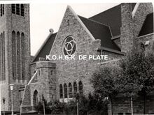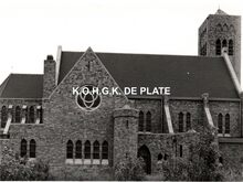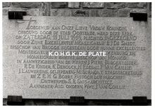 "Toegewijd aan Onze Lieve Vrouw Koningin, gebouwd door de stad Oostende, werd deze kerk op Zaterdag 11 juli 1959, plechtig ingezegend door Zijne Excellentie Monseigneur E.J. De Smedt., bisschop van Brugge, bijgestaan door hunne excellenties Monseigneur Lommel, Bisschop van Luxemburg en Monseigneur Barthe, Bisschop van Monaco in aanwezigheid van de heren J. Piers, burgemeester, R. De Kinder, K. Dehouck, H. Edebau, F. Van Caillie, J. Lauwereins, schepenen, M. Surmont, stadssecretaris. Ontwerper S.R. Smis - architect. aannemer: alg. onder. Wwe J. Van Coillie"