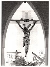 Links en rechts onder : twee panelen van de Kruisweg door Willy Bosschem