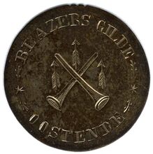 Op de voorzijde : rondom boven BLAZERS GILDE, rondom onder OOSTENDE, centraal twee gekruiste blaaspijpen en 3 pijlen