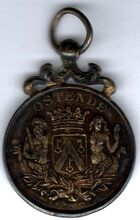 Op de voorzijde : rondom boven OSTENDE, centraal het gekroonde wapenschild met keper en drie sleutels van de stad Oostende, geflankeerd door twee schildhouders, links meerman met zwaard naar links kijkend, rechts meermin met handspiegel naar rechts kijkend, alles geplaatst op palmbladeren samengebonden met een lint, middenonder gesigneerd A. DISPERSYN