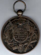 Op de keerzijde : rondom links een eikentak, rondom rechts een lauriertak onderaan samengestrikt, centraal DE VEREENIGDE / KARABIJNSCHUTERS / A LA Ste LE FLOBERT CLU / DU LITTORAL / CONCOURS / DU 15-2-25