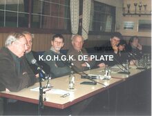 Formaat : 10 x 13 cm. - Panelgesprek met links, Georges Allaert, Mich De Langhe (derde) en naast hem Luc Glorieux