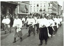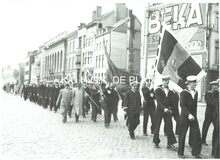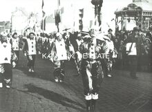 Vergroting. - Formaat : 30 x 40 cm. - Optocht van de Staatszeeloodsen met vlag. Hier op de Vindictivelaan nabij het Onze Lieve Vrouwe College.
