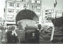 Vergroting. - Formaat : 30 x 40 cm. - Een praalwagen met vissers en hoorn des overvloeds met gerookte haring op het Wapenplein tegen de hoek Louisa- en Brabantstraat.