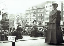 Vergroting. - Formaat : 30x 40 cm. - Halfvastenstoet op het Wapenplein. Een maquette van een vissersboot gevolgd door een fanfare. De Oostendse reuzen Tone en Wanne kijken toe.