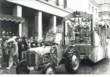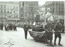 Vergroting. - Formaat : 30 x40 cm. - Een praalwagen van de "Koninklijke Maatschappij der Vereenigde Karabijnschutters" uit Bredene in de halfvastenstoet op de Torhoutsesteenweg De wagen herdenkt de raid van de Britse admiraal Popham op de sluizen van het Sas tijdens de Franse bezetting onder Napoleon.