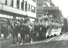Vergroting. - Formaat : 30 x 40 cm. - Een praalwagen getrokken door twee paarden op de Alfons Pieterslaan, ongeveer ter hoogte met het kruispunt Romestraat.