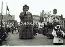 Vergroting. - Formaat : 30 X 40 cm. - De Oostendse reuzen Tone en Wanne op het Wapenplein. Foto genomen richting Breidelstraat. Rechts de Kerkstraat. Het Feest- en Cultuurpaleis is nog niet gebouwd.