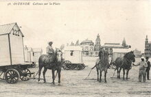 Formaat : 9 x 14 cm. - 96 OSTENDE Cabines sur la Plage. De badkarren werden getrokken door paarden. In de achtergrond zien we het derde kursaal