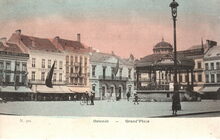 Formaat : 9 x 14 cm. - N. 502. Ostende - Grand'Place. Rechts van de kiosk, hotel de l'Empereur (hoek Brabantstraat), daarnaast CafΓ© des Nations. Links van de kiosk, de Stadsbibliotheek(hoek Louisastraat), links daarvan Hotel restaurant Du Damier, en dan het gebouw van de Cercle Coecilia en The Falstaff