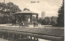 Formaat : 9 x 14 cm. - Ostende Parc. In de achtergrond de toren van het postgebouw