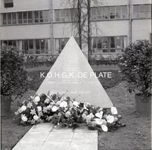 Negatief : 6 x 6 cm. - De plechtigheid begon om 10 u met een stoet van de leerlingen, voorafgegaan door de stadsharmonie, van de Noorse stallingen, aan de Koninginnelaan, waar de vroegere "vakschool" was gevestigd, naar de nieuwe school. Bij de ingang, te midden van een plantsoen, werd de gedenksteen opnieuw ingehuldigd voor de gesneuvelde en vermoorde leerlingen van de Stedelijke Vakschool tijdens de Tweede Wereldoorlog. De gedenksteen werd ingehuldigd op 22 juni 1952 ter gelegenheid van de feesten van het 50-jarig bestaan van de Stedelijke Vakschool aan de Koninginnelaan. Het stond aan de ingang.