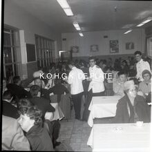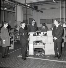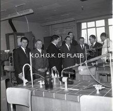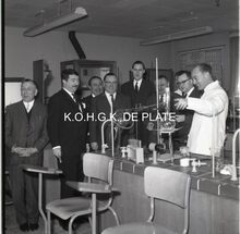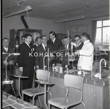 Negatief : 6 x 6 cm. - Rondleiding in het lokaal scheikunde. We herkennen : Marcel Friederichs, gemeenteraadslid, (?), Roger De kinder, eerste schepen, John Lauwereins, schepen van Openbaar Onderwijs, Jan Piers, burgemeester, Walter Debrock, adjunkt-kabinetchef bij het Ministerie van Nationale Opevoeding en Cultuur, Jozef Decleyre, directeur van de school en leraar Etienne Devijlder