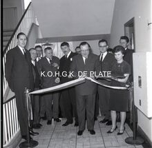 Negatief : 6 x 6 cm. - Schepen van Openbaar Onderwijs, John Lauwereins zal het lint doorknippen in aanwezigheid van burgemeester Jan Piers, Roger De Kinder, eerste schepen, Jozef Decleyre, directeur van de school en onbende mevrouw