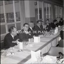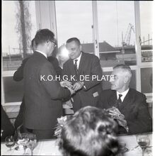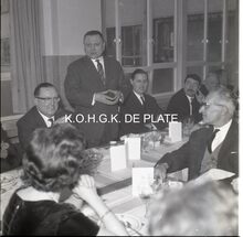Negatief : 6 x 6 cm. - Staand, rechts Walter Debrock, adjunkt-kabinetchef bij het Ministerie van Nationale Opvoeding en Cultuur en Jozef Decleyre, directeur van de school