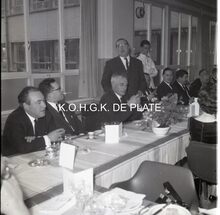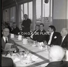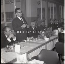 Negatief : 6 x 6 cm. - Schepen van Openbaar Onderwijs, John Lauwereins houdt zijn toespraak. Een sigaar roken hoorde er ook bij.