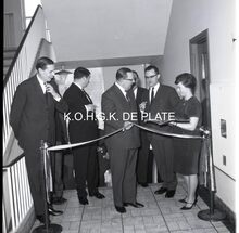 Negatief : 6 x 6 cm. - Schepen voor Openbaar Onderwijs, John Lauwereins knipt het lint door in aanwezigheid van o.a. Jan Piers, burgemeester, Walter Debrock, adjunkt-kabinetchef bij het Ministerie van Nationale Opvoeding en Cultuur, Roger De Kinder, eerste schepen, Jozef Decleyre, directeur van de school...