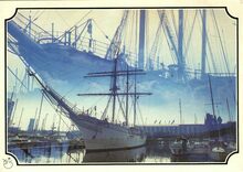 Het zeil- en schoolschip "Mercator" als museum gemeerd in het tweede handelsdok of Mercator jachthaven. Op de achtergrond, het Stadhuis langs de Leopold II-laan. Links, de oude watertoren nabij het Maria-Hendrikapark.