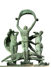 Formaat : 10,5 x 15 cm. - Bronzen beeldhouwwerk "De Vier Elementen" vervaardigd door Oscar Jespers in 1952 en geΓ―nstalleerd op de luifel van het Casino-Kursaal in mei 1955. Brons : 560 x 415 x 180 cm.