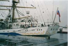 Formaat : 10 x 15 cm. Russisch zeil- en schoolschip MIR,Β bouwjaar 1987 met thuishaven Sint-Petersburg
