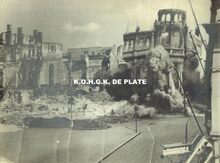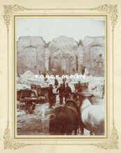 Formaat : 24 x 18 cm. - Puin ruimen van de afgebrande Sint Pieterskerk