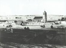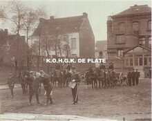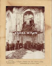 Formaat : 24 x 18 cm. - Een groep mannen bij de puinen van de afgebrande kerk. Waaronder notaris Van Caillie, advocaat Albert Van der Heide en zijn zoon, Henri Desmet, Aug. Christiaens, Hamman en Verheecke, pastoren Leire, Wittouck, Dewasch en Libert