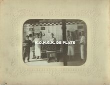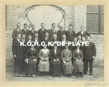Formaat : 22 x 28 cm. - v.l.n.r. eerste rij : M.A. Lescrauwaet (voorzitter) ; Z.E.H. Camerlynck (deken van Oostende en erevoorzitter) ; Jules Van der Heyde (volksvertegenwoordiger en senator) E.H. Louis Colens ; Henri Baels