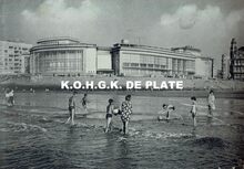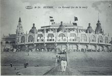 Formaat : 28 x 40 cm. - Zicht op het vierde kursaal en de zeedijk vanaf het Groot Strand. In de voorgrond enkele toeristen die pootje baden