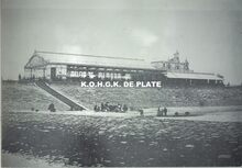 Afdruk. - 29 x 42 cm. - Paardenkoers op de Wellingtonrenbaan. In de achtergrond rechts de ingang van het Royal Palace Hotel