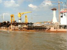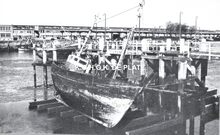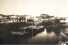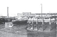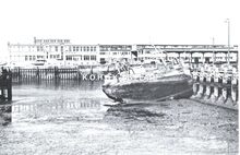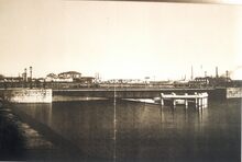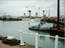 Formaat : 10 x 13,5 cm. - Vooraan, de Visserskaai en het Montgomerydok. Op de oosteroever bouwt men de betonnen sokkels voor de windmolens