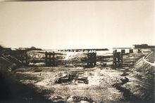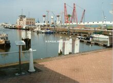 Formaat : 10 x 13,5 cm. - We zien op de oosteroever de bouw van de betonnen sokkels voor de windmolens. Vooraan, de Visserskaai en het Montgomerydok. Rechts, detail van het Zeewezengebouw.