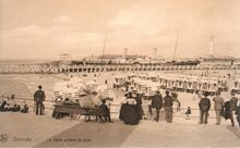 Genieten van de gezonde zeelucht tijdens een zonnige namiddag. We zien het einde van het Weststaketsel met het café-paviljoen en de mistbel in het ijzeren torentje.