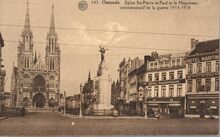 Albert, N° 143. - Ostende - Eglise Sts-Pierre et Paul et le Monument commémoratif de la guerre 1914-1918. - Op de voorgrond het Monument ter nagedachtenis van de Oostendse oorlogsslachtoffers, zowel burgers als militairen uit de Eerste Wereldoorlog. Links, de Sint Petrus-en Pauluskerk. Rechts, Hotel Shakespeare en Hotel Maritime