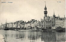 Rechts, een Kaap Hoorn-vaarder gemeerd langs de Keizerskaai nabij de stedelijke opslagplaatsen. Zij voerden guano (natuurlijke meststof) in uit Chili. Links, een aantal stoomtreilers
