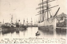 Vaartuigen gemeerd in het eerste handelsdok. Waaronder enkele vrachtschepen en wat verder stoomtreilers. Links zien we de Keizerskaai met op de hoek van de Zuidstraat, het Zeevaartcommissariaat ofpilotage . In de achtergrond, het eerste Zeestation.