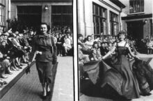 Afdruk, formaat : 11 x 17cm. - Modeshow op de speelplaats van de Stockholmstraat. Links, tailleur D. Van Heule. Rechts, avondjapon S. GermonprΓ©