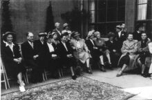 Formaat : 18 x 24 cm. - De vernissage op 11/04/1968. Tentoonstelling met 14 affiches ontworpen door de Franse kunstschilder en graficus Georges Mathieu in opdracht van Air France. Derde links, kunstschilder Jef Van Turenhout. Derde rechts, Hugo Brutin en echtgenote