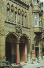 Formaat : 15 x 10 cm. - De voorgevel. ReliΓ«fs met emblemen van diverse beroepssectoren in timpanen onder vensters eerste verdieping. BasreliΓ«f met bijenkorf omgeven door rankwerk boven de bogen aan de ingang. Beeldhouwer Prosper Baeys. Norbert Hostyn in De Plate 2012, april, p.77
