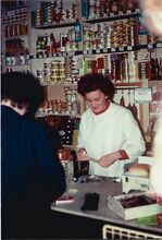 Afdruk, formaat : 10 x 9,5 cm. - In deze boekhandel kon men van alles krijgen, en bij het begin van het schooljaar werd de winkel overrompeld door de leerlingen. Mevrouw Degryse was een vertrouwd beeld achter de stapels boeken en dagbladen en van achter haar stoel achter de toonbank leidde zij de zaak en zo verloor ze niets uit het oog (Dries De Gryse)
