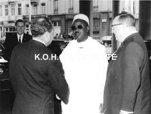 Formaat : 18 x 24 cm. - De president van Kameroen wordt bij zijn aankomst begroet door Emilien Michiels. Rechts, waarnemend burgemeester John Lauwereins en links, Jan Piers, minister-staatssecretaris Openbaar Ambt en Toerisme