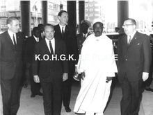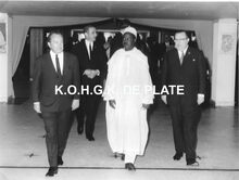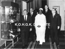 Formaat : 18 x 24 cm. - De president van Kameroen in het gezelschap van Emilien Michiels, directeur van de kursaal, Pierre van Outryve d'Ydewalle, provinciegouverneur en John Lauwereins, waarnemend burgemeester
