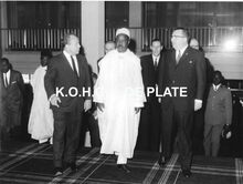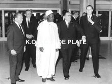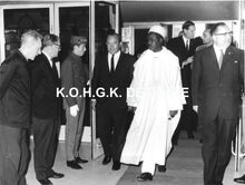 Formaat : 18 x 24 cm. - De president van Kameroen bij zijn aankomst. Van links naar rechts : Emilien Michiels, directeur van de kursaa, Pierre van Outryve d'Ydewalle, provinciegouverneur, de president, John Lauwereins, waarnemend burgemeester en Jan Piers, minister-staatssecretaris Openbaar Ambt en Toerisme