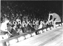 Formaat : 18 x 24 cm. - De president bij zijn aankomst.Links, drie personeelsleden van het casino-kursaal, Emilien Micheiels, directeur van de kursaal, de president van Kameroen, Jan Piers in gesprek en waarnemend burgemeester John Lauwereins
