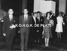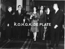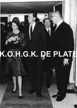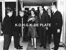 Formaat : 18 x 24 cm. - De koning en de koningin bij hum aankomst. Links, conservator Frank Edebau en achter hem, schepen Raymond Miroir. Naast de koning, waarnemend burgemeester John Lauwereins en Roger De RamΓ©e, directeur van de kursaal