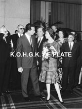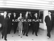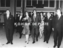 Formaat : 18 x 24 cm. - De koning en de koningin in het gezelschap van : links, conservator Frank Edebau, schepen Raymond Miroir en de provinciegouverneur Pierre van Outryve d'Ydewalle. Naast de koning, waarnemend burgemeester John Lauwereins en Roger De RamΓ©e, directeur van de kursaal