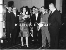 Formaat : 18 x 24 cm. - De koningin in het gezelschap van links, Kamiel Dehouck en waarnemend burgemeester John Lauwereins. Rechts, Roger De RamΓ©e, directeur van de kursaal, een militair en schepen Raymond Miroir